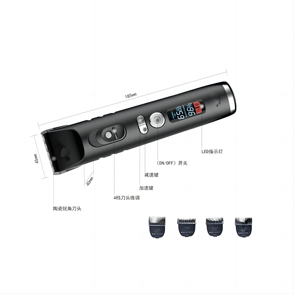 • หน้าจอ LED ความละเอียดสูงจะแสดงระดับแบตเตอรี่แบบเรียลไทม์ ป้องกันไฟฟ้าขัดข้องระหว่างการตัดแต่งขน และช่วยให้การตัดแต่งขนที่บ้านหรือบริการเสริมสวยมีความราบรื่นยิ่งขึ้น